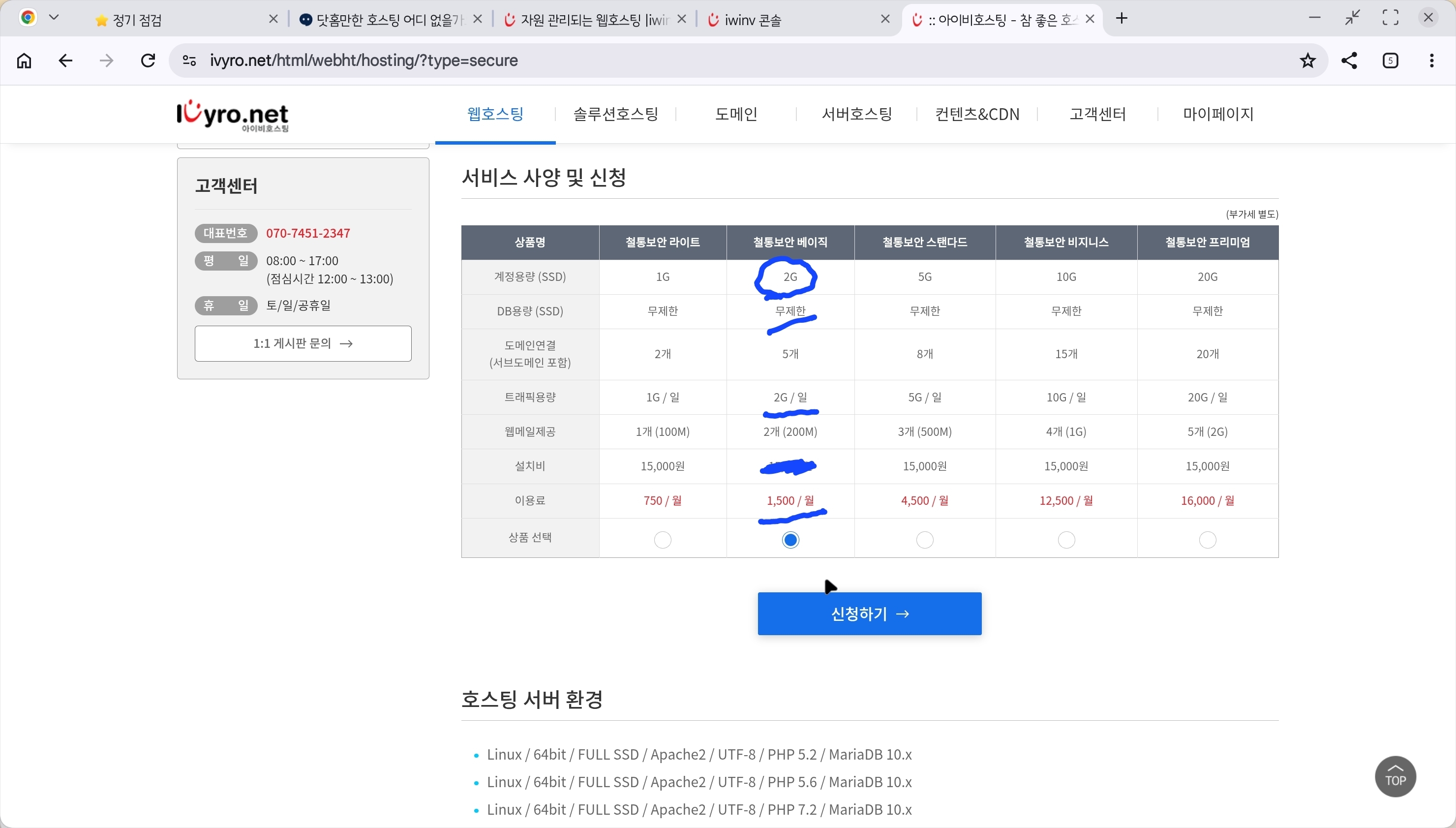 아이비 호스팅으로 할경우 첨부사진의 스펙으로 갈건데...