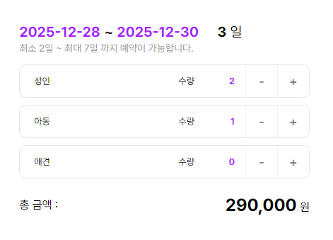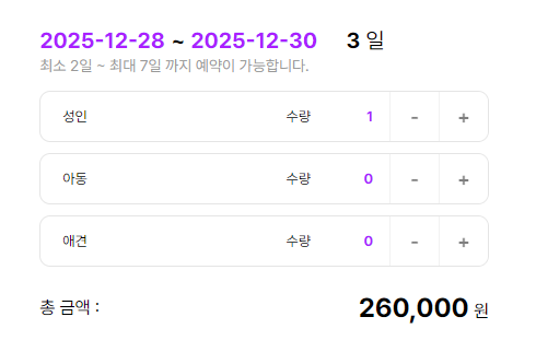하지만 소비자가 신청하는 페이지에서는 성인, 아동, 애견을 선택할때마다 금액이 올라가는데 왜 올라가는지 알수가 없어서 혼란스러울것같습니다