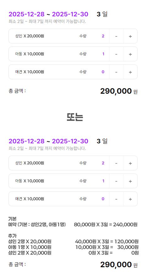 누가봐도 성인 1명에 따른 20,000원 추가금액이 들어간걸 알수 있죠.