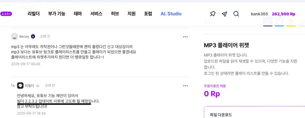 리빌더미니홈 1:1 대화하기미니홈 1:1 대화하기 13시간 전 안녕하세요, 2.2.6 배포이후 4월부터 부가기능 전체 업데이트, 신규 부가기능이 예정되어 있습니다. 4월중 순차적으로 업데이트 될것같습니다. 감사합니다! 2026-03-30 21:45 안녕하세요, 2.2.6 배포이후 4월부터 부가기능 전체 업데이트, 신규 부가기능이 예정되어 있습니다. 4월중 순차적으로 업데이트 될것같습니다. 감사합니다!