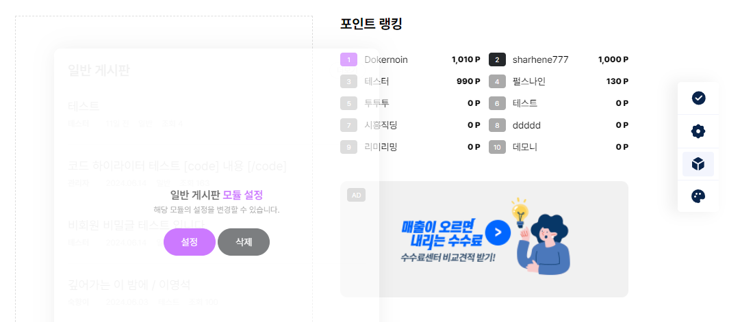 오토 레벨링 게시물등록, 댓글등록, 출석 등을 동한 경험치획득 형태의 레벨링 시스템 입니다. 레벨링 조건을 설정할 수 있습니다.