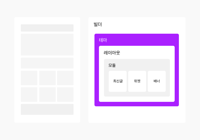 빌더는 빌더 > 테마 > 레이아웃 > 모듈의 구성으로 이루어져 있습니다.