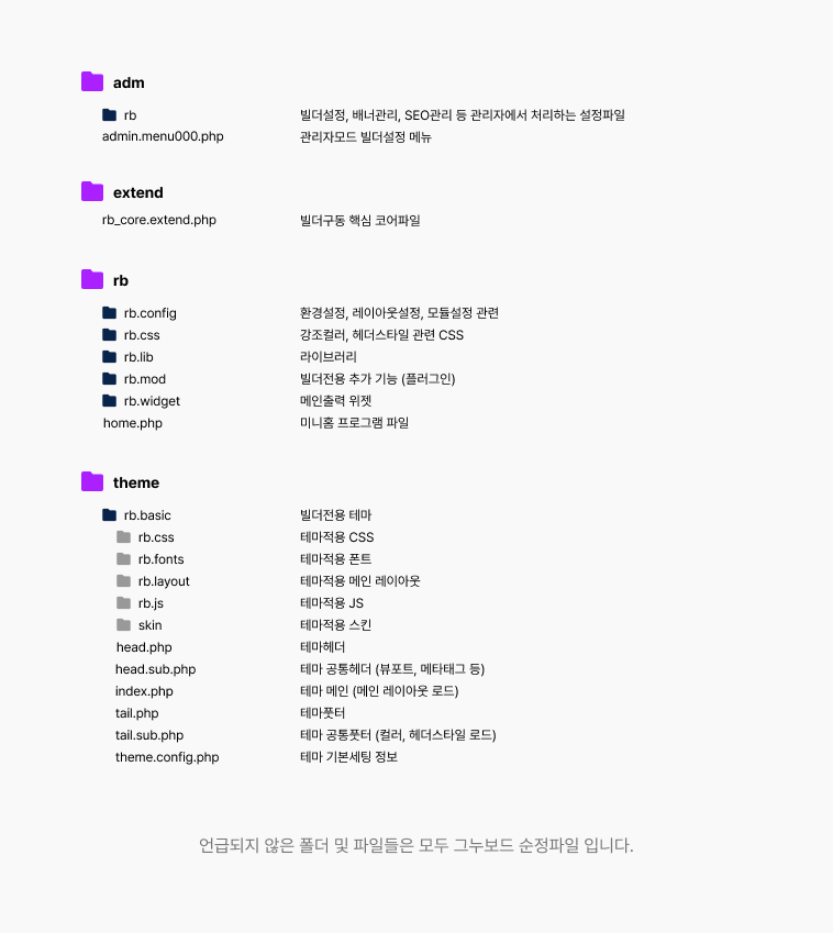 빌더는 빌더 > 테마 > 레이아웃 > 모듈의 구성으로 이루어져 있으며 그누보드 순정 파일 및 구조를 변형하지 않고 폴더의 추가만으로 작동하도록 설계되어 있습니다. 중복되는 폴더는 없으며, 특수한형태 (그누보드 순정에서 스킨을 제공하지 않는) 의 경우 선택적 패치를 통해 변경이 가능하도록 배포하고 있습니다.