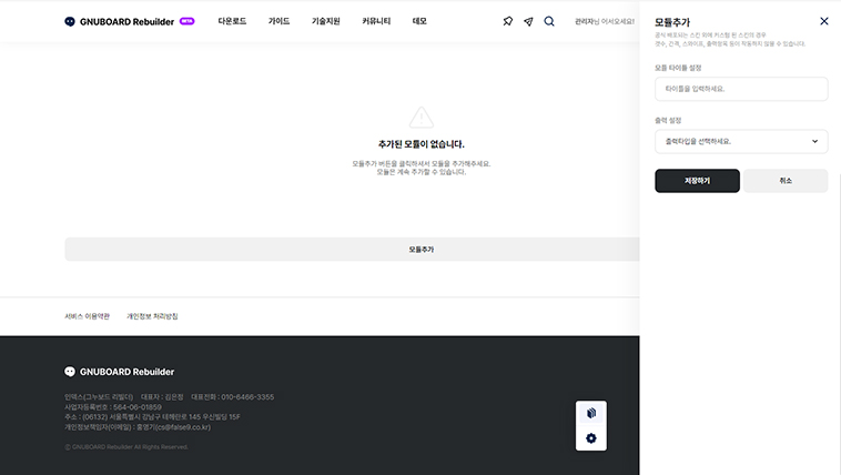 • 관리자로 로그인 한 후 메인페이지의 하단부에 [모듈 추가] 를 클릭하시면 사이드메뉴가 활성화 됩니다.