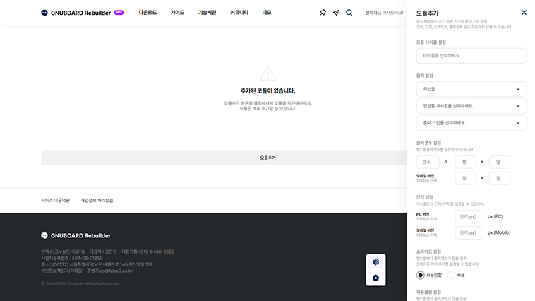 레이아웃과 모듈(최신글, 위젯, 배너)은 기본세팅 외에 사용자가 직접 추가할 수 있도록 구성되어 있으며, 폴더 및 파일을 추가하는 것만으로 모듈설정과 연동 됩니다.
