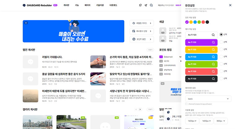 환경설정 강조컬러, 헤더스타일, 폰트, 컨텐츠 가로폭 등을 설정할 수 있습니다.