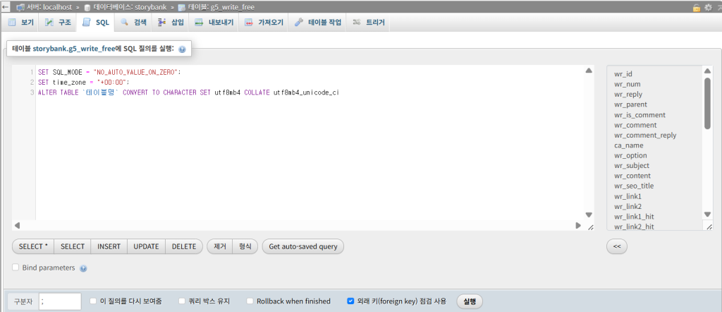 디비 테이블 언어셋변경(utf8mb4_unicode_ci) - 'wr_datetime'의 유효하지 못한 디폴트 값을 사용하셨습니다. 오류 해결
